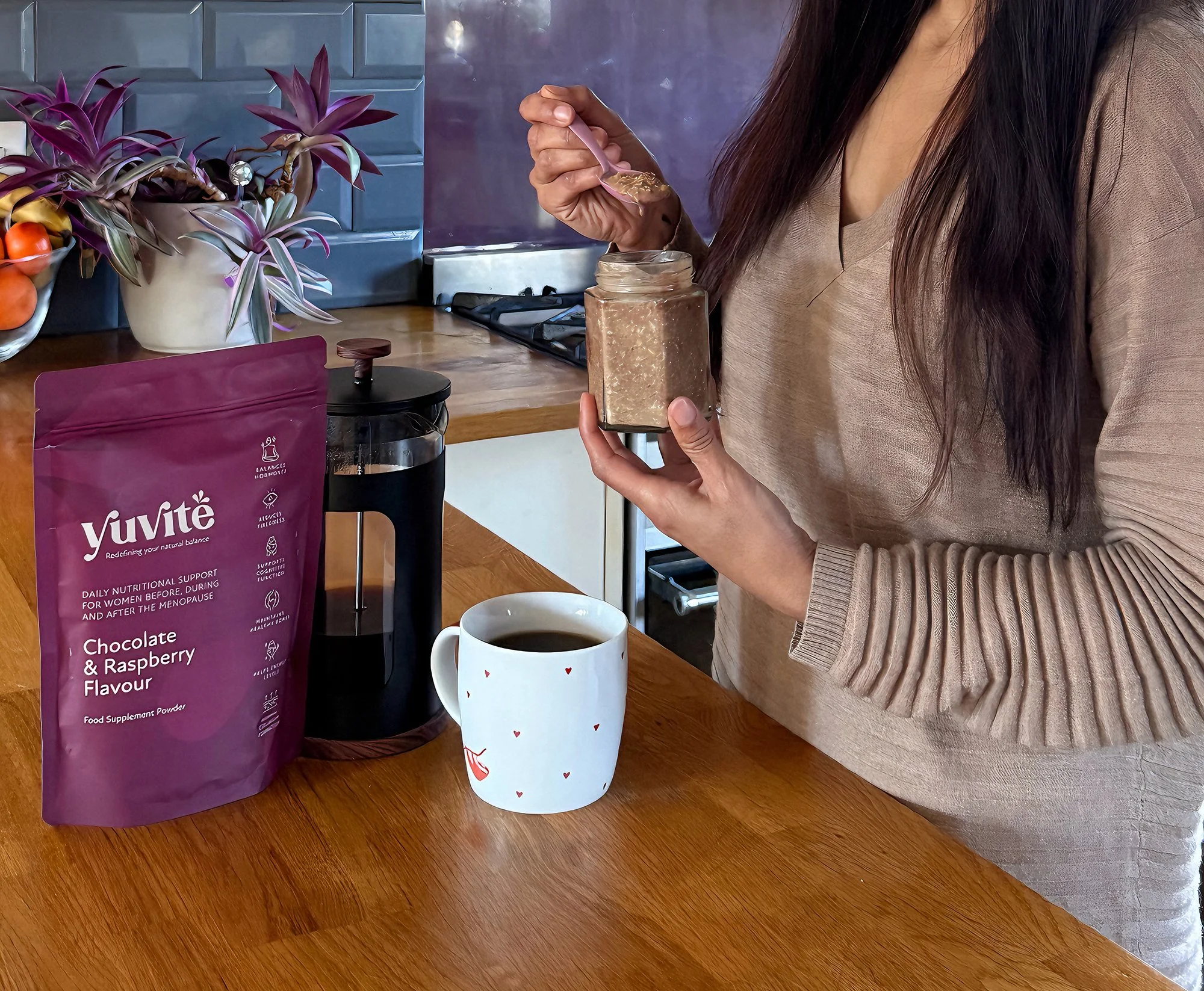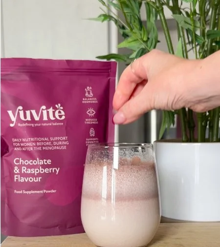Yuvité Chocolate and Raspberry flavour menopause nutrition is a convenient way to support your body with a simple daily ritual packed with the key nutrients essential to sustain your energy and wellbeing.